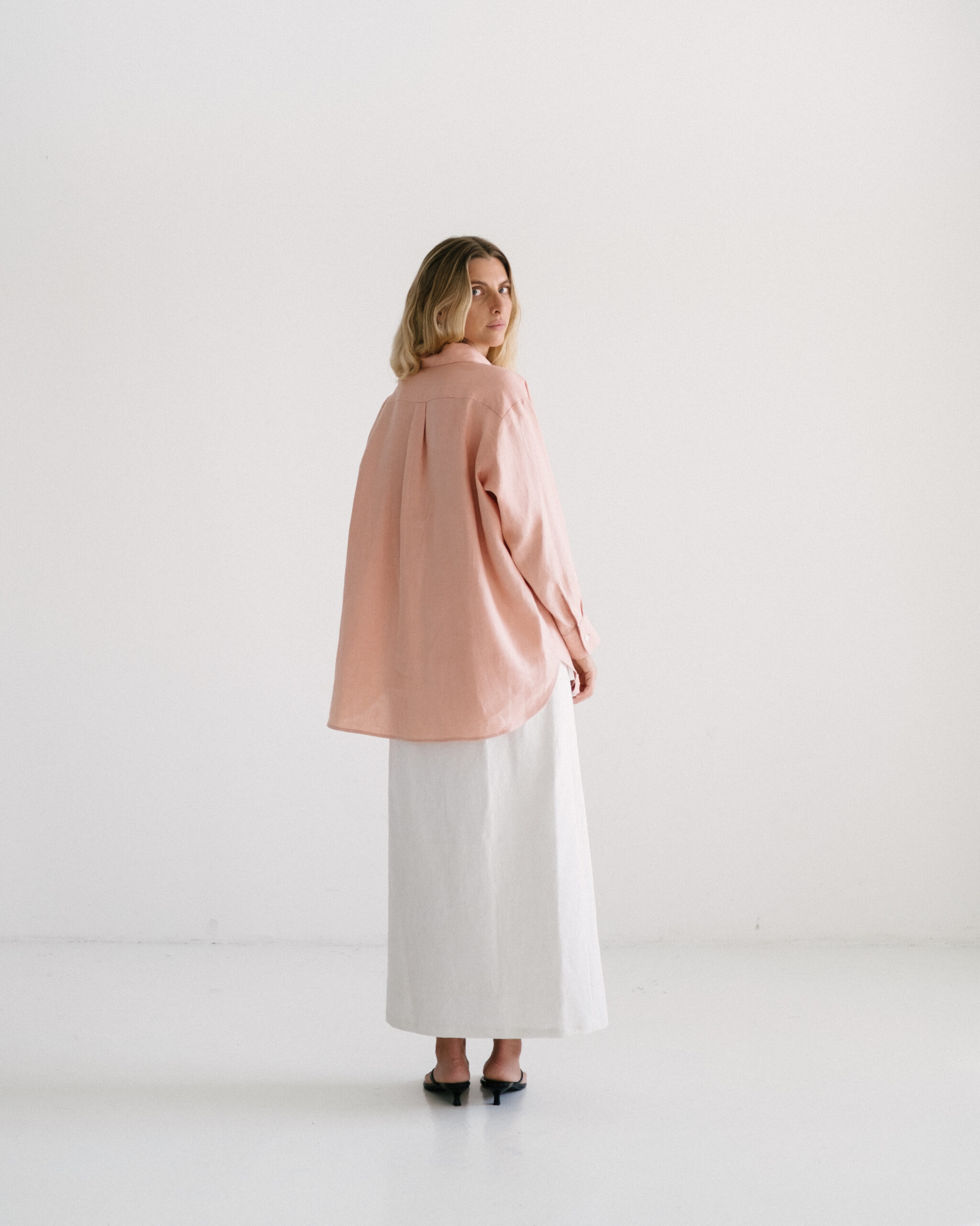 Oversize-Leinenbluse, sportlich-elegant kombinierbar zu Hosen, Jeans oder Jupes. Nachhaltig mit Krapp (Pflanze) vom Schweizer Hersteller Lilablum natürlich gefärbt – ein einzigartiges Kleidungsstück.