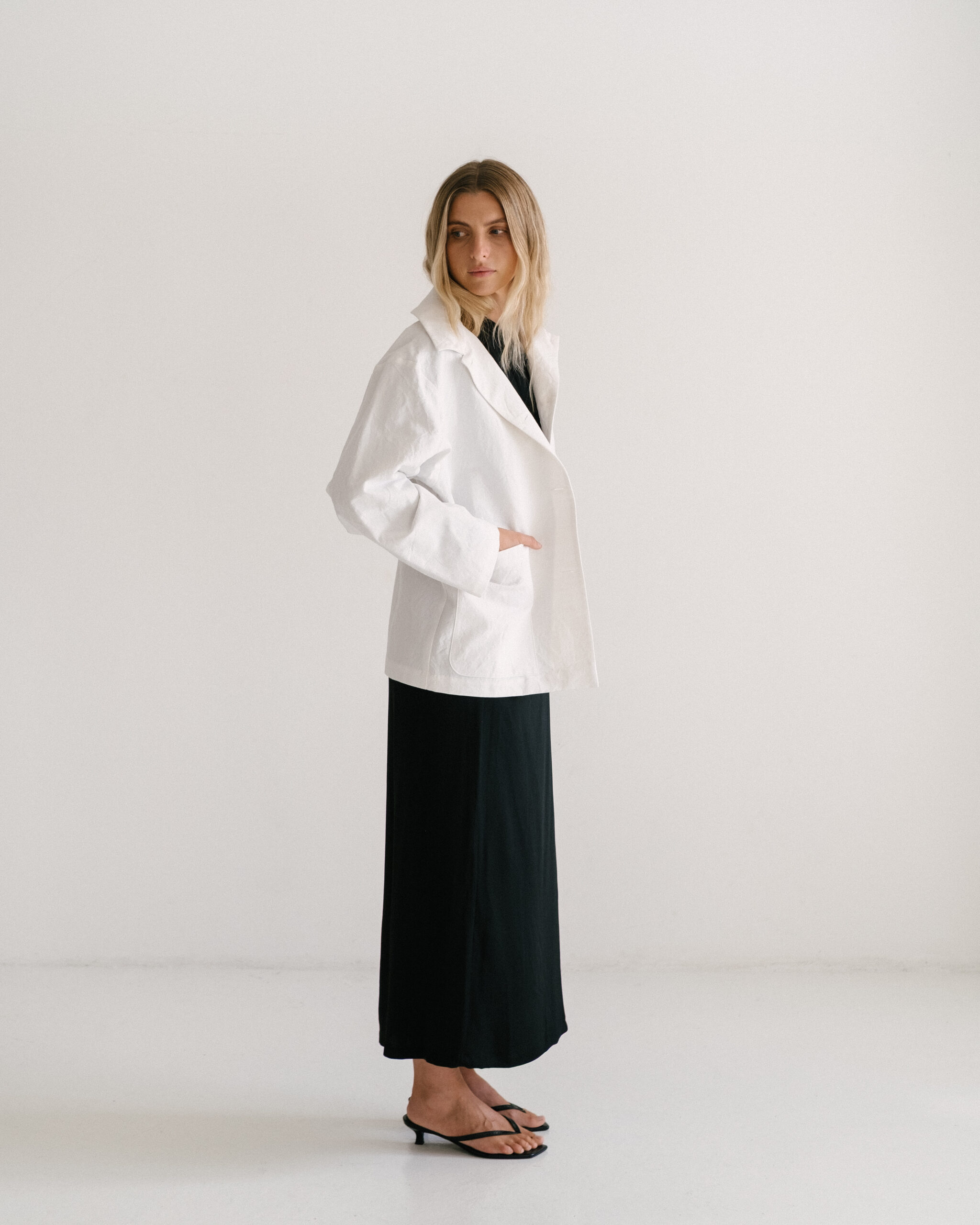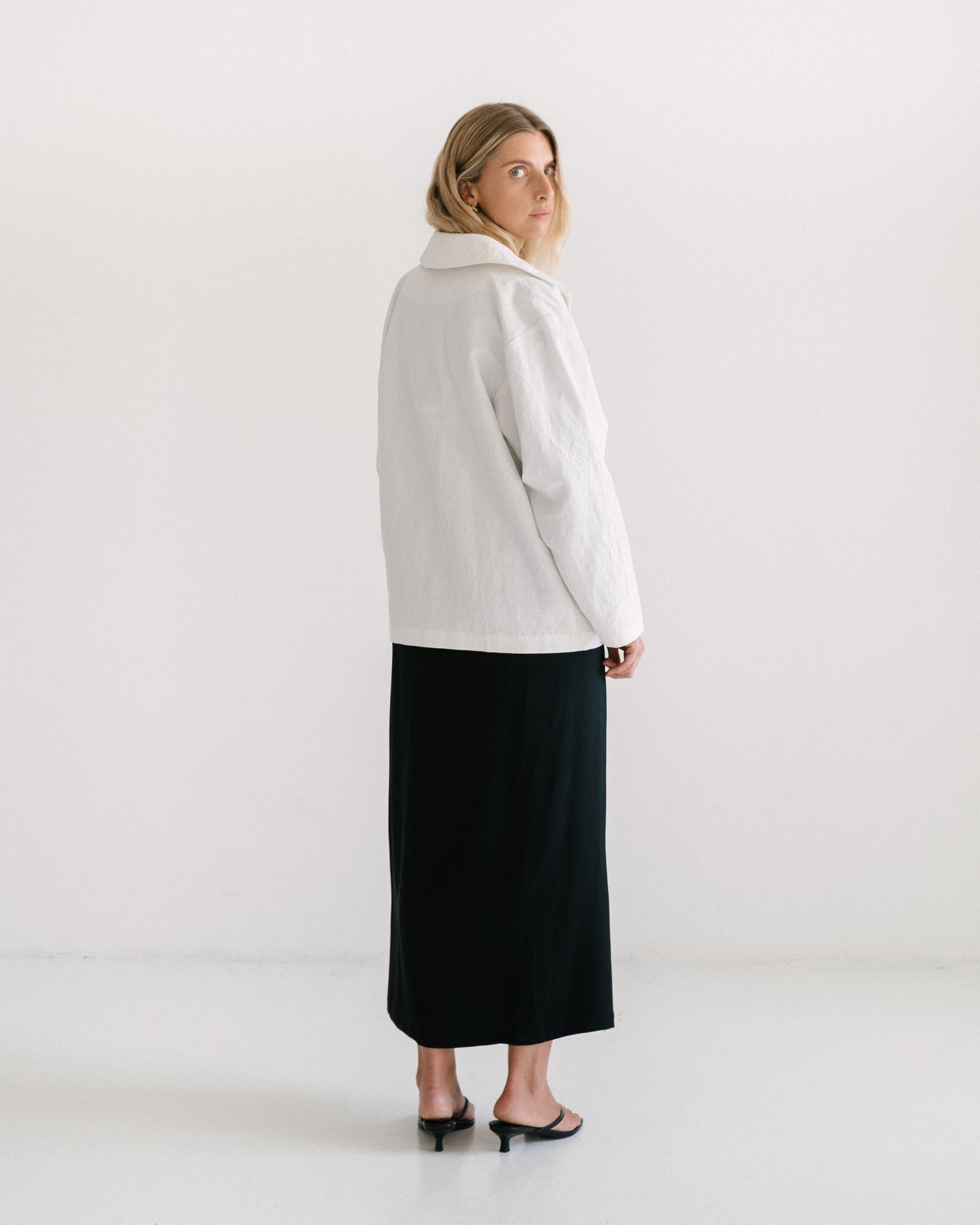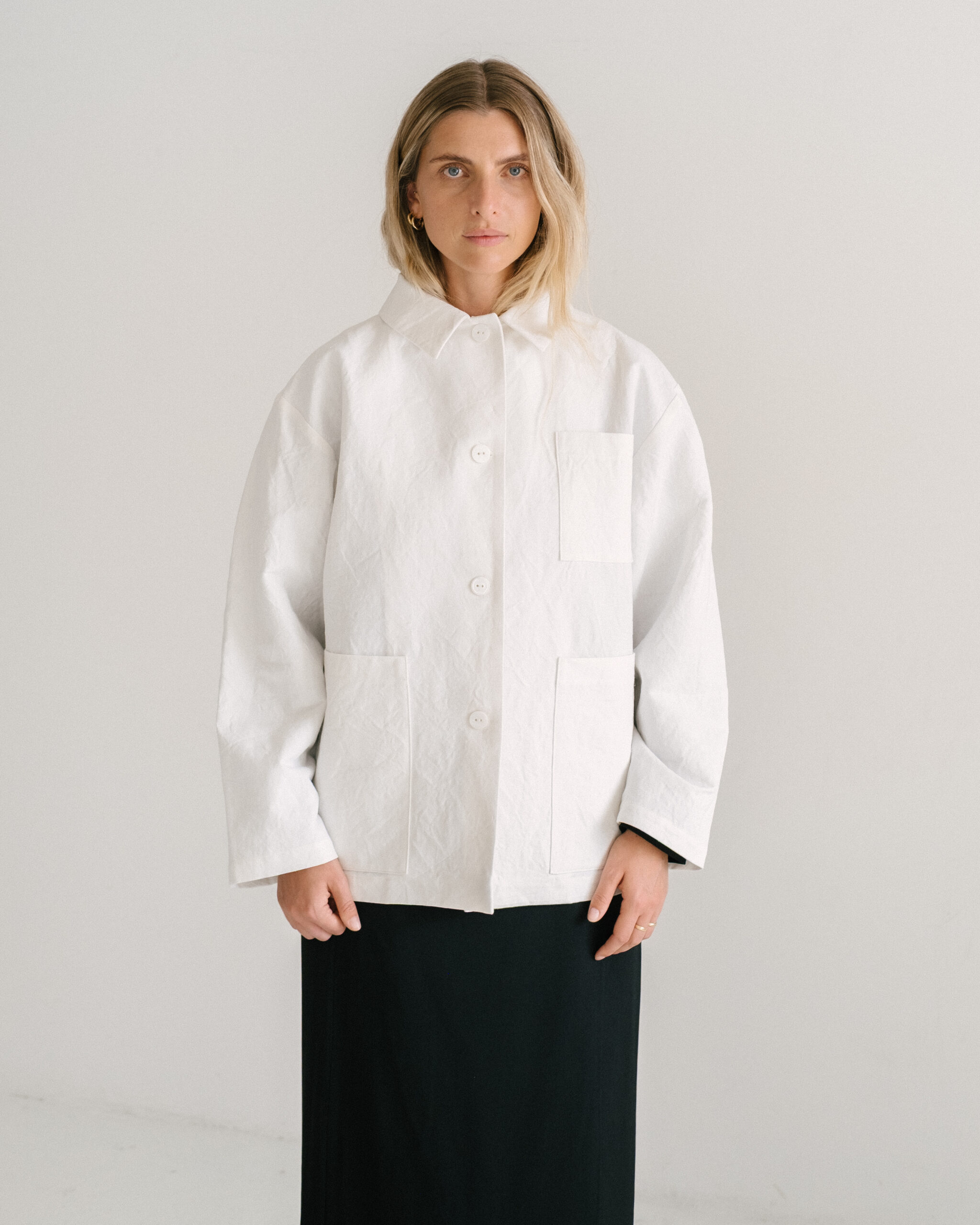 Die Leinenjacke mit Kragen, drei aufgesetzten Taschen und Oversize-Schnitt vereint zeitloses Design mit langlebiger Qualität. Sie besteht aus hochwertigem Schweizer Leinen, wodurch jede Jacke ein einzigartiges Unikat wird. Die Jacke überzeugt durch ihre Vielseitigkeit: Sie passt zu Hosen, Röcken oder Kleidern und verleiht jedem Outfit einen modernen, eleganten Look. Ihr Oversize-Schnitt sorgt für Komfort und Bewegungsfreiheit. 100 % Swiss Made und 100 % kompostierbar – inklusive Knöpfe und Etiketten – vereint diese Jacke Nachhaltigkeit, Qualität und Design.