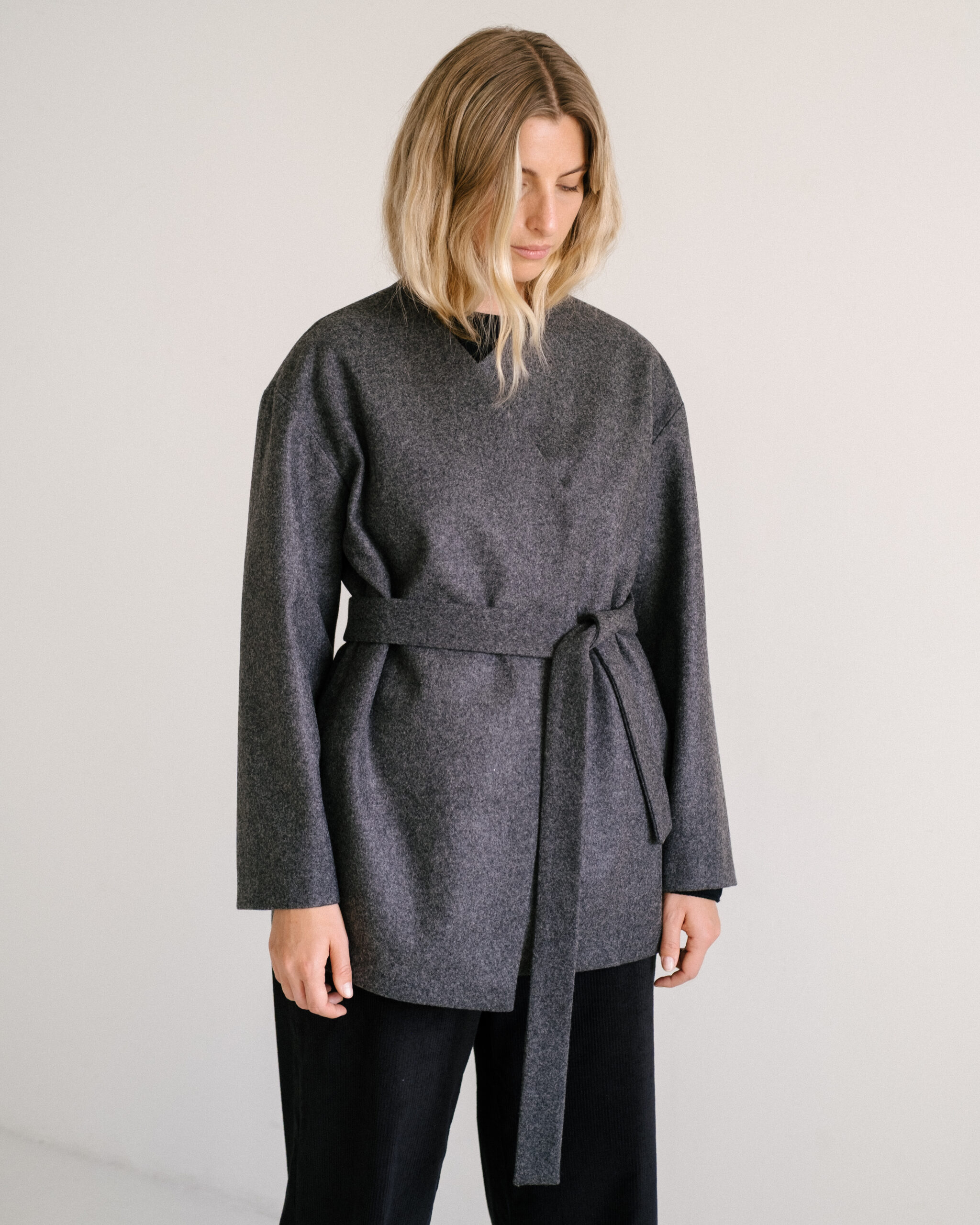 Die asymmetrische Wolljacke ist offen oder geschlossen mit oder ohne Gürtel tragbar. Vielseitig kombinierbar zu Röcken, Hosen oder Kleidern. Stilvoll, warm und komfortabel für jeden Anlass.
